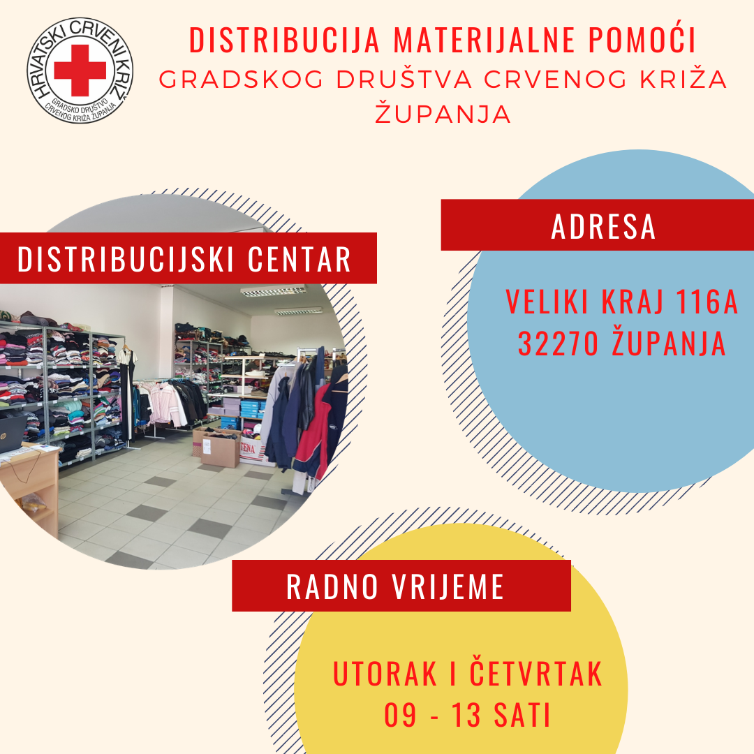 U Distribucijskom centru, korisnici projekta „Nada – Hoffnung“ i drugi korisnici primatelji Zajamčene minimalne naknade moći će u navedenom radnom vremenu doći po materijalnu pomoć (rabljenu odjeću, obuću, kućanski tekstil, male kućanske aparate i slično).