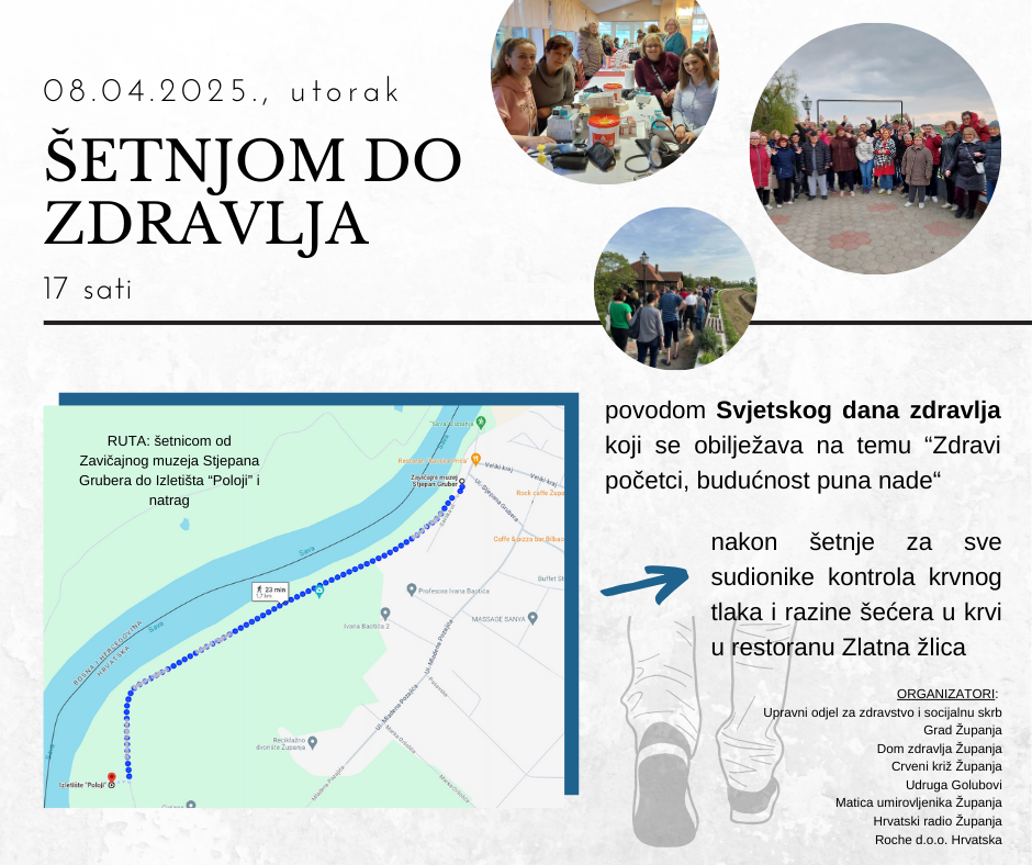 Svjetski dan zdravlja obilježava se svake godine 07. travnja, a ovogodišnji je posvećen zdravlju majki i novorođenčadi uz slogan „Zdravi početci, budućnost puna nade“! Upravni odjel za zdravstvo i socijalnu skrb VSŽ, Grad Županja, Dom zdravlja Županja, Gradsko društvo Crvenog križa Županja, Udruga Golubovi, Matica umirovljenika Županja, Hrvatski radio Županja i Roche d.o.o. Hrvatska, organiziraju akciju „Šetnjom do zdravlja“ koja će se održati 08.04.2025.godine (utorak) u 17 sati. Zamišljeni pravac kretanja je od Gradskog muzeja Grada Županje do Poloja i povratno, a po završetku uputiti ćemo se u restoran Zlatna žlica gdje će medicinske sestre Doma zdravlja Županja izvršiti kontrolu RR i ŠUK-a pod pokroviteljstvom Rocha.