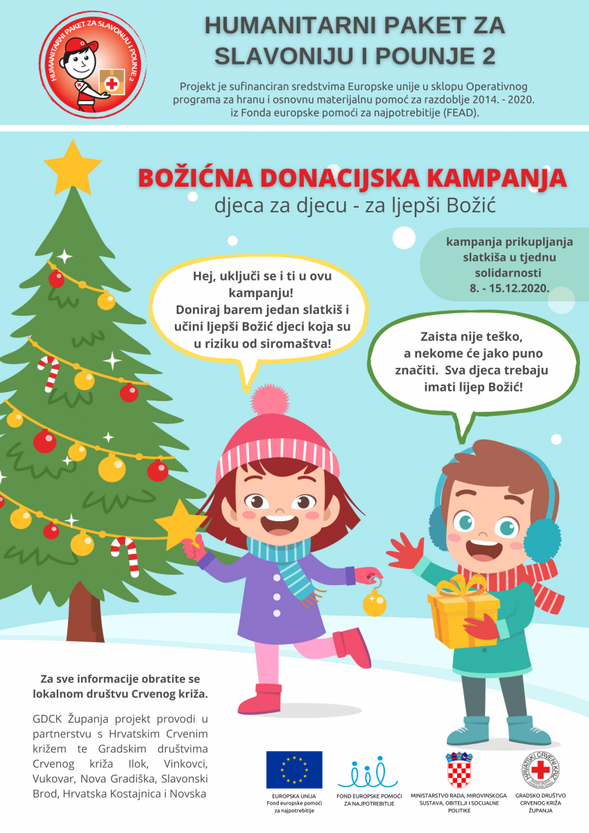 U okviru projekta „Humanitarni paket za Slavoniju i Pounje 2“ Gradsko društvo Crvenog križa Županja provodi božićnu donacijsku kampanju „Djeca za djecu – za ljepši Božić“. Kampanja je osmišljena kao božićna kampanja u kojoj bi djeca osnovnoškolske i srednjoškolske dobi donirali slatkiše za djecu obitelji slabijeg imovinskog statusa te djecu koja žive u riziku od siromaštva.