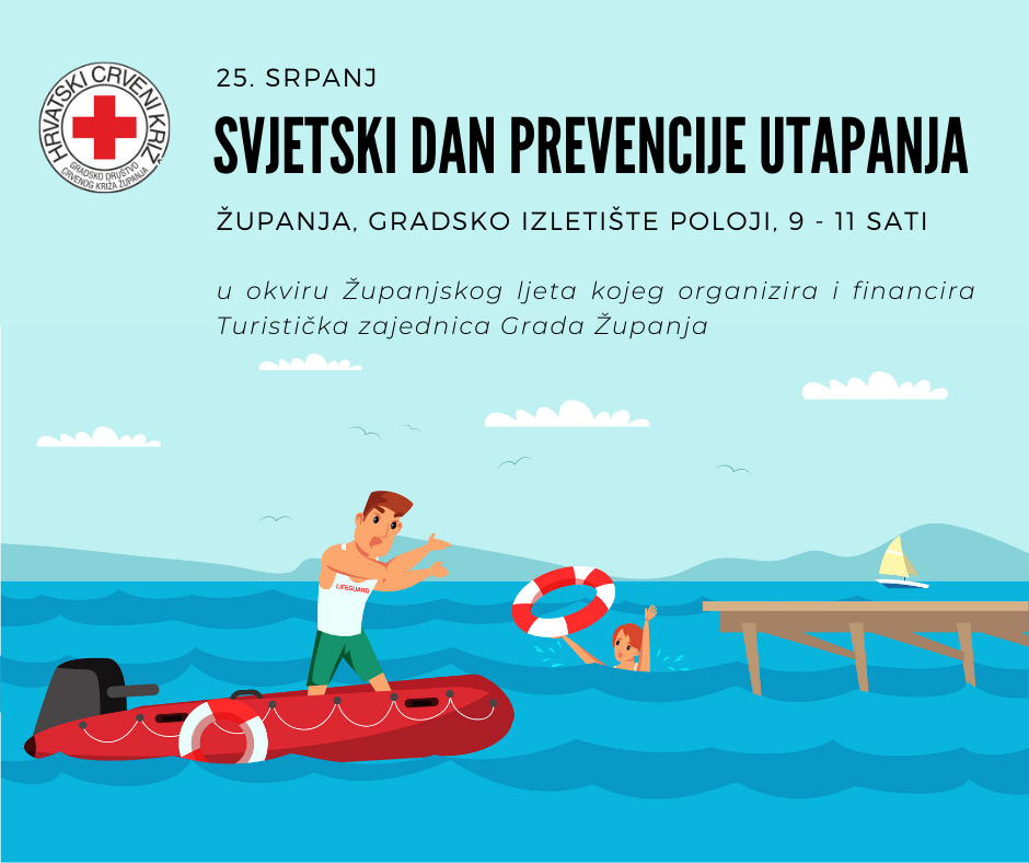 Hrvatski Crveni križ Gradsko društvo Crvenog križa Županja dana 25. srpnja 2022. godine od 9 do 11 sati obilježava Svjetski dan prevencije utapanja, u okviru Županjskog ljeta koje organizira i financira Turistička zajednica Grada Županje.